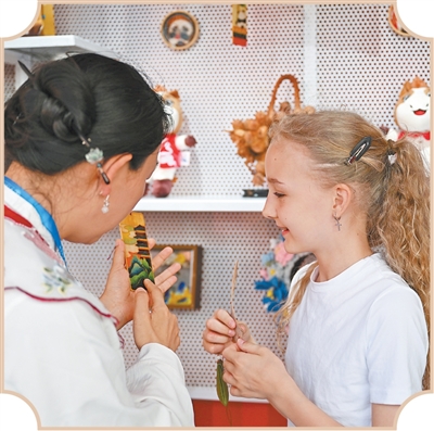俄羅斯游客在撫遠(yuǎn)市東極廣場特色集市上挑選商品。