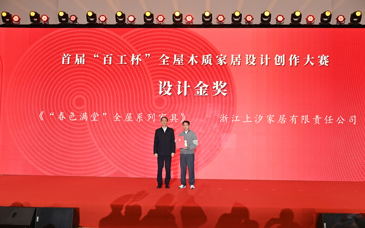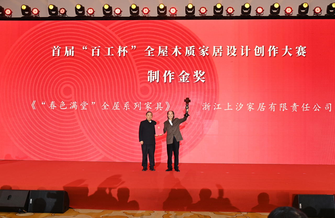 現(xiàn)場舉行了首屆“百工杯”全屋木質(zhì)家居設(shè)計(jì)創(chuàng)作大賽頒獎(jiǎng)儀式。本次大賽得到全國各地創(chuàng)作者的積極響應(yīng),百套作品入圍。獨(dú)攬制作和設(shè)計(jì)兩項(xiàng)金獎(jiǎng)的浙江上汐家居有限責(zé)任公司負(fù)責(zé)人作了交流分享,當(dāng)場表示將獎(jiǎng)金捐出,用于設(shè)立東陽木雕家居產(chǎn)品設(shè)計(jì)創(chuàng)新發(fā)展基金。